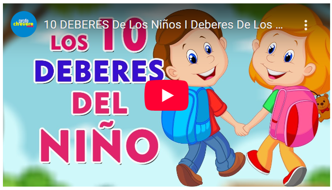 “La profe chévere.compresenta: Los diez deberes de los niños: 1. Respetar a nuestros semejantes; 2. Respetar a nuestros padres y cuidadores; 3. Respetar las opiniones y costumbres de los demás; 4. Respetarnos y cuidarnos a nosotros mismos; 5. Hablar siempre con la verdad; 6. Cumplir con los deberes escolares; 7. Ayudar en el hogar, en la escuela y la sociedad; 8. Respetar y cuidar el medio ambiente; 9. No consumir sustancias dañinas; 10. Respetar a nuestra patria".